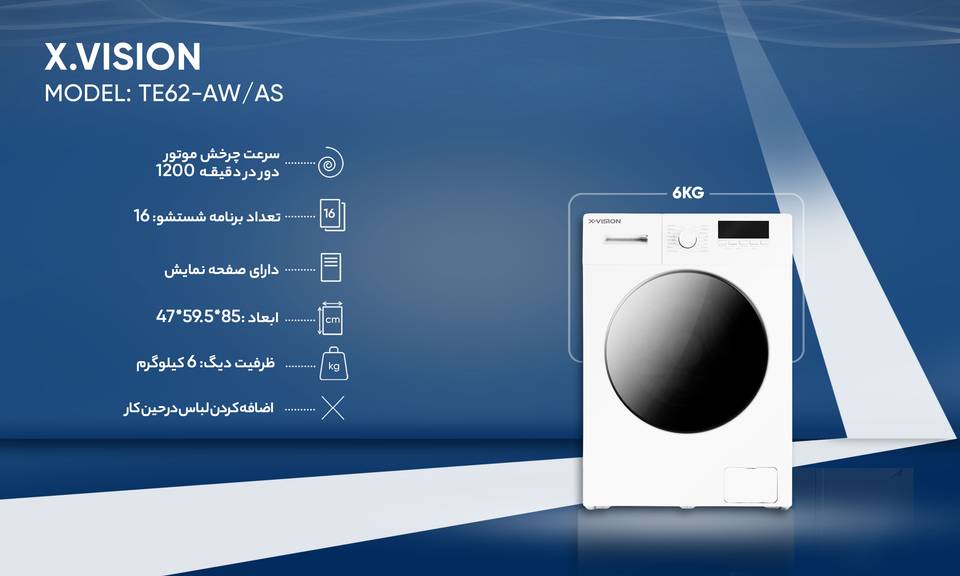 ماشین لباسشویی مدل TE62-AW/AS محصول شرکت xvision در سایزهای 6 ، 7، 8 کیلوگرمی یک گزینه ایدهآل برای هر مصرفکننده ایرانی با زندگی مدرن محسوب میشود. ایکس ویژن با تکیه بر اعتبار مادیران و اعتماد مردم و مهمتر از همه، تولید محصولات باکیفیت توانسته در مدت کوتاهی جایگاه خوبی را در میان مصرفکنندگان خود به دست آورده و به یکی از محصولات مورد اطمینان بازار تبدیل شود. موتور تسمهای یونیورسال قدرتمند این محصول با فراهم آوردن سرعت چرخش 1200 دور در دقیقه، ظرفیت 6 کیلوگرمی، درام کریستالی و جنس استیل ضدزنگ این محصول را به محصولی بادوام و مستحکم تبدیل کرده است. این دستگاه نه تنها البسه را به طور کامل تمیز میکند بلکه باعث حفظ کیفیت لباس ها نیز خواهد شد. ماشین TE62-AW/AS با رتبه مصرف انرژی +++A وارد بازار شده و تجربهی صرفه جویی در مصرف آب و برق و در عین حال کیفیت شستشوی بالاتر را برای شما فراهم میکند. برای این لباسشویی 16 حالت برنامهی شستشو تعریف شده و از صحفه نمایش باکیفیتی برا نمایش آن بهره میبرد . از سایر امکانات آن میتوان به حالت شستشوی سریع 15 دقیقه ای ، سیستم کنترل سرریز آب، حالت شستشوی تاخیری delay wash و نیز قابلیت اضافه کردن لباس بعد از شروع شستشو اشاره کرد. در حالت Add Wash پس از چند ثانیه از فعال کردن آن، سطح آب پایین آمده و امکان باز شدن درب فراهم میشود و شما میتوانید لباسها را اضافه و مجددا برنامه شستوشو را فعال کنید. به این ترتیب، شستن لباسهایی که جا مانده اند تا زمان شستوشوی بعدی به تعویق نمیافتد .فناوری تعادل خودکار البسه (Auto Balance) با گردش متناوب و نیم دور دستگاه در دور خشک کن ، باعث قرارگیری یکنواخت لباسها در داخل درام شده وعلاوه بر جلوگیری از لرزش و تکانهای شدید ، از گره خوردن و چروک شدن لباسها نیز جلوگیری مینماید.